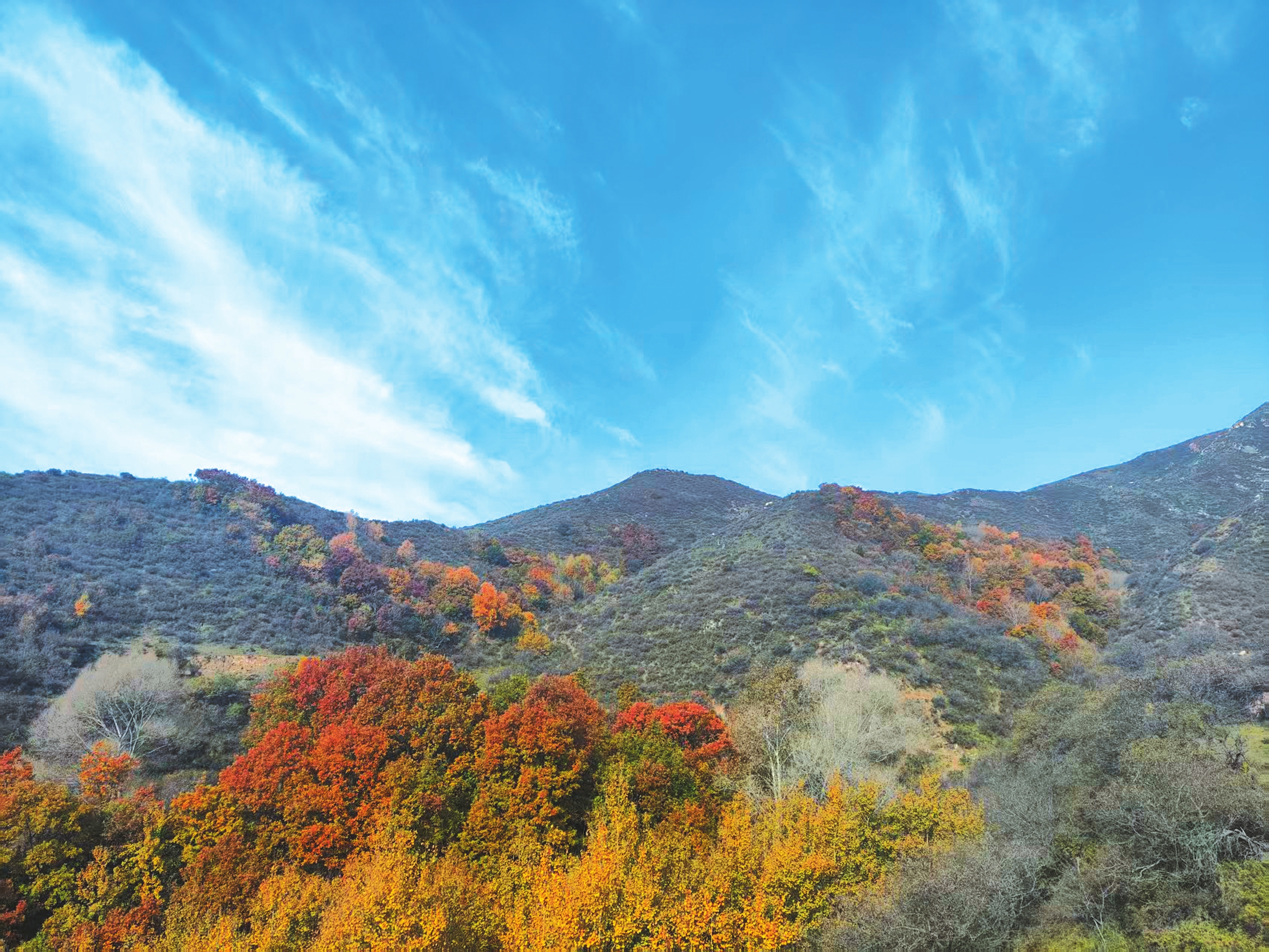 驅(qū)車從原平城內(nèi)出發(fā),沿著鄉(xiāng)村公路向西南方向行進(jìn),路徑曲折。當(dāng)走到樓板寨時,公路向西北方向直沖大山深處。從遠(yuǎn)山生發(fā)出的多條溪流在峽谷匯集,在兩山之間汩汩流淌。四望群山之上,不同樹種呈現(xiàn)出了各自的顏色。黃得極致,紅得放肆,紫得夸張,粉得嫵媚,而綠也不再是原先的綠,柔和得讓人心疼。這哪里是山,分明是一個調(diào)色板。
