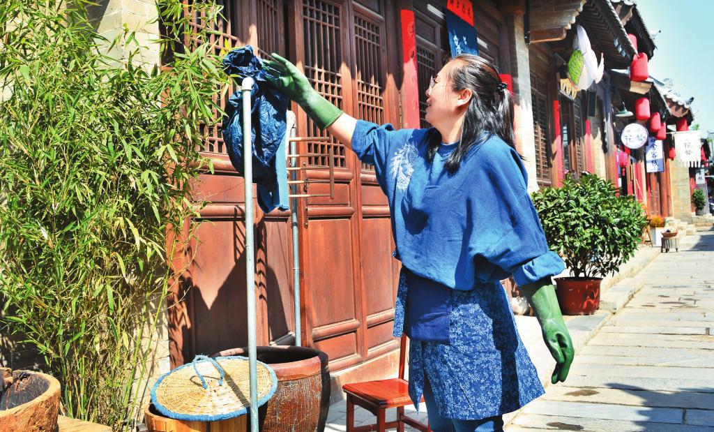 趙慧的藍(lán)染缸是金貴的,但她并不藏私,只要有人愿意學(xué),她總是歡喜接納。來到古城之后,她開展了很多次藍(lán)染體驗活動,大人和孩子們戴上手套,穿好工作服,來到染缸前,把自己親手扎好或畫好的白布放進(jìn)去,起先出來是綠色,然后是淺藍(lán)、深藍(lán),最后得到一塊有白色花紋和圖案的藍(lán)染作品。趙慧愿意把藍(lán)染的樂趣和神奇與更多的人分享,因為她懂得,只有讓更多的人了解和知道,天然染這項古老的技藝才能傳承下去,而不會丟失在時光里。