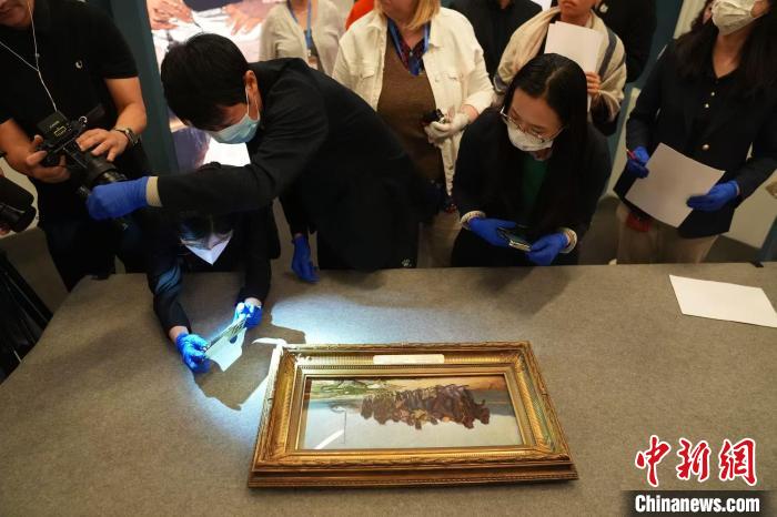 中俄兩國(guó)專家共同檢視剛開(kāi)箱的《伏爾加河上的纖夫》油畫(huà)草圖。 史春陽(yáng) 攝