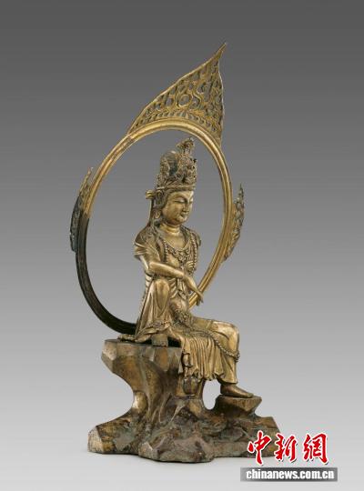 中新網(wǎng)金華9月17日電(董易鑫 孫媛媛)高53厘米,整尊觀音頭戴高冠,冠上飾化佛,身佩瓔珞,左臂撐巖,右臂置膝,左腿下垂,右腿上曲足踏巖石,安坐于山巖之上,身旁石上置一凈瓶,身后一圓輪狀大背光,渾圓精美,邊緣裝飾火焰紋,仿佛巖前有潺潺流水,觀音目觀水中月影——這是68年前出土于浙江金華萬佛塔地宮的五代鎏金銅觀音造像,也叫作“水月觀音”,是國家一級(jí)文物,現(xiàn)藏于中國國家博物館。