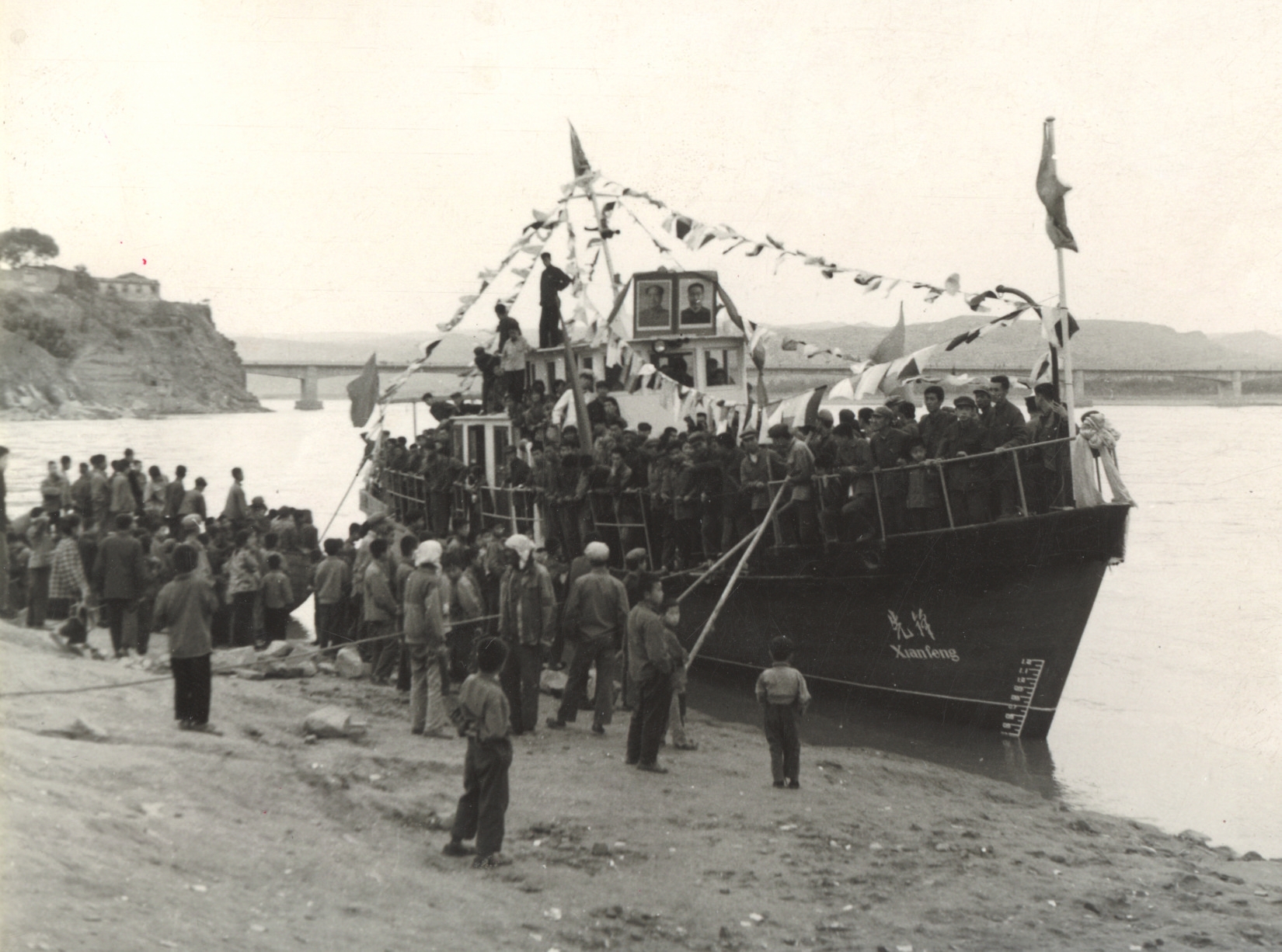 保德縣的木船造得快,取名“先鋒號”,于1977年5月23日,農(nóng)歷四月初六正式下水。這是晉陜峽谷有史以來第一艘機(jī)動船,千年未有之新鮮事,少不了要隆重慶賀。有老照片記錄當(dāng)年盛況:黃河水流浩大,“先鋒號”泊于岸邊,駕駛艙頂上并排矗立著偉人的大幅畫像,上用紅綢花裝飾,船頭船尾紅旗招展,四條彩帶從駕駛艙頂端連向船沿??h領(lǐng)導(dǎo)排坐于船上,禮儀小姐扯著紅綢,河岸上站滿了看熱鬧的群眾。河風(fēng)吹動大小旗幟,機(jī)船顯得威風(fēng)凜凜。