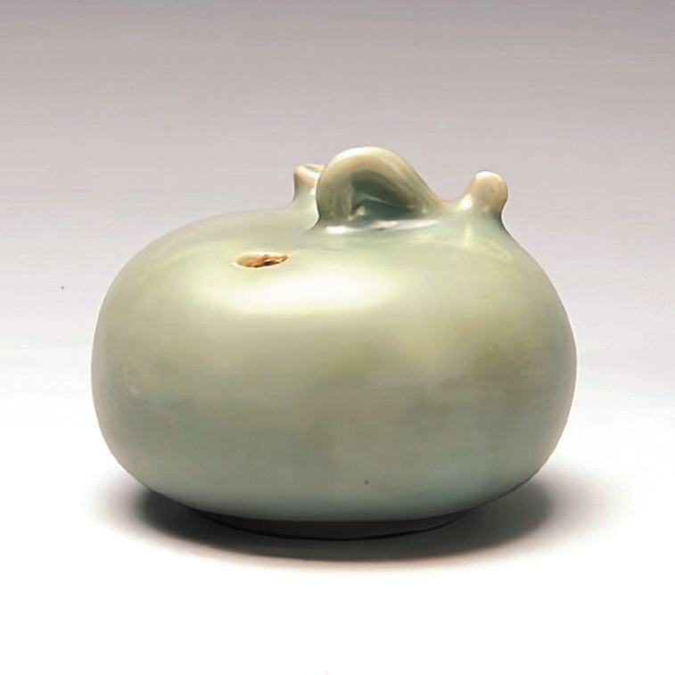 杭州博物館館藏的南宋龍泉窯粉青釉柿形瓷水注,宛如一枚剛摘下的青柿,小巧玲瓏,一掌可握。這件器物高4.6厘米,口徑6.2厘米,底徑3.8厘米,中空扁圓的鼓腹設(shè)計,盡顯靈動之態(tài)。頂部中心微凹,環(huán)繞的五片柿葉花紋若隱若現(xiàn),突破了傳統(tǒng)“一尖兩彎”的柿蒂紋范式,更添清新意趣。葉片間隙貼飾S形細泥條,構(gòu)成半圓形困藤鈕,精巧別致。肩部一側(cè)設(shè)出水短流,另一側(cè)留圓形注水孔,暗藏巧思:使用時先注滿水,移至硯臺旁以手指堵住注水孔,借負壓鎖住水流,再根據(jù)研墨需求緩緩移開手指控制出水量,實則是利用大氣壓強差調(diào)控水流的精妙設(shè)計,在方寸之間實現(xiàn)了功能與美感的完美融合。器物通體施粉青釉,釉面光潤細膩,足底處的火石紅痕跡,是歲月留下的鮮明印記。其精致的器型與瑩潤的釉色,盡顯文人雅士的清雅審美,既是南宋文房的精品之作,更見證了龍泉窯在青瓷史上的美學(xué)巔峰。