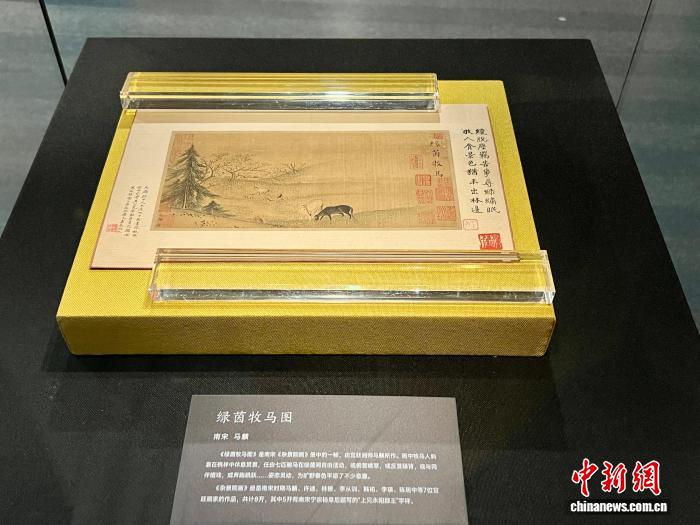 《綠茵牧馬圖》為國家一級文物,由南宋宮廷畫師馬麟所作。畫中牧馬人斜靠在桃林中休息賞景,任由七匹駿馬在綠茵間自由活動,或俯首啃草,或與同伴嬉戲,或奔跑跳躍……姿態(tài)靈動,為曠野春色平添了不少意趣。杜芝明表示,為最大限度地保護(hù)文物,該展品僅面向公眾展出一個(gè)月。