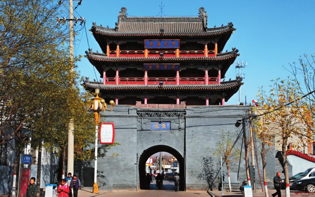 地處府城中心的鼓樓,是府城的最高建筑。明成化年間(1465年——1487年)建成,清光緒十七年(1891年)重修。鼓樓通高20米,磚石結(jié)構(gòu)臺基,上有三層建筑。鼓樓的奇特之處是底層磚碹洞是十字洞,東西南北四面皆通。東西兩個洞使七百戶街保持直通,成為寧武府城最長最寬的街。南北兩洞延伸,將頭百戶、三百戶、五百戶、九百戶幾條街連成一片,既便于排水,又方便出行。西門刻“鳳儀”,東門刻“含陽”,下題“光緒辛卯圜郡重建”。磚洞以上是三層木結(jié)構(gòu)建筑,面寬五間,進深四椽,四周圍廊,檐柱間設(shè)雀替。三重檐歇山頂,一重檐下東西設(shè)隔扇門,其余為墻體。二、三重檐下東西面懸匾,東為“樓煩重鎮(zhèn)”“毓秀鐘靈”,西為“奎光普照”“層霄聳翠”。鼓樓為省級文物保護單位。