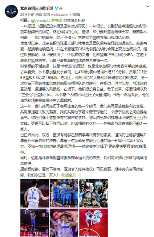 北京首鋼男籃官方微博截圖
