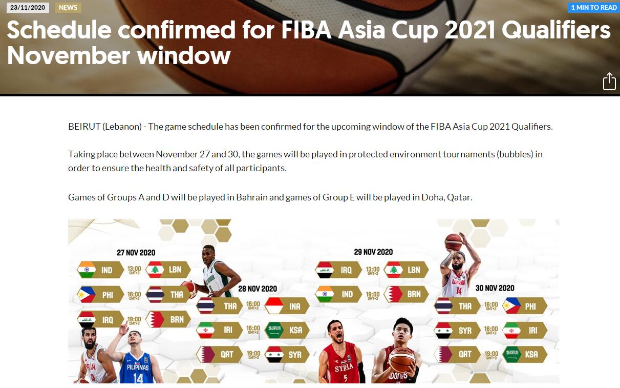 官方網(wǎng)站截圖 據(jù)介紹,由于相關(guān)防疫規(guī)定,有些國家和地區(qū)籃協(xié)所屬政府當局不允許球隊進行國際旅行,進而導(dǎo)致有些球隊無法參加本窗口期比賽,國際籃聯(lián)被迫對亞洲杯預(yù)選賽11月窗口期賽程進行調(diào)整。 本次國際籃聯(lián)亞洲杯預(yù)選賽共分為6個小組,每個小組4支球隊,小組前兩名可以直接獲得正賽資格,各小組第三名展開資格賽較量,爭奪最后4個席位,亞洲杯正賽將有16支參賽球隊。此次確認的三個主辦城市分別為巴林首都麥納麥、卡塔爾首都多哈和約旦首都安曼,其中,麥納麥承辦A組、D組的全部比賽,B組、E組的比賽將在多哈進行,安曼則承接F組的比賽。至于澳大利亞、新西蘭、關(guān)島、中國香港所在的C組,暫未確定比賽主辦城市。 此前,國際籃聯(lián)發(fā)布消息稱,考慮到球員、教練員、工作人員的安全與健康,現(xiàn)階段窗口期比賽取消原本的主客場制,改為在同一賽區(qū)進行,比賽將在封閉環(huán)境中進行。 (責(zé)任編輯:蔡文斌) |