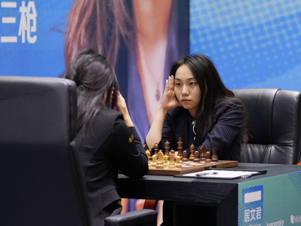 當(dāng)日的比賽居文君執(zhí)白先行采用后翼?xiàng)壉_局,雷挺婕以雙馬防御。隨后挑戰(zhàn)者選擇主動出擊,雙方進(jìn)行了激烈爭奪,居文君一度在后翼與中心承受不小壓力,但她防守精確,滴水不漏,也耗去雷挺婕不少時間。二人隨后進(jìn)行了一系列子力交換,轉(zhuǎn)入大致均勢的車象兵殘局,最終至第40回合雙方形成三次重復(fù)局面和棋。