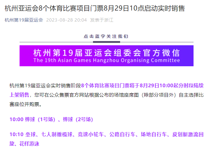 本批次項(xiàng)目上架后,杭州亞運(yùn)會56個可售項(xiàng)目均已開售。29日上午9:00起,部分項(xiàng)目座席經(jīng)規(guī)劃優(yōu)化后,釋放出的場次門票全部面向公眾銷售,請大家予以關(guān)注。