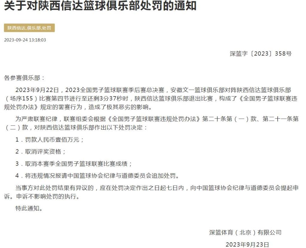 新華社北京9月24日電 針對(duì)陜西信達(dá)籃球俱樂部在全國(guó)男子籃球聯(lián)賽(NBL)總決賽第一場(chǎng)比賽中途棄賽事件,NBL聯(lián)賽組委會(huì)24日通過官方微博發(fā)布情況說明,將該行為認(rèn)定為罷賽,總決賽后續(xù)場(chǎng)次不再進(jìn)行。中國(guó)籃球協(xié)會(huì)官方網(wǎng)站隨后發(fā)布了處罰通知,聯(lián)賽組委會(huì)對(duì)陜西信達(dá)籃球俱樂部罰款100萬(wàn)元,取消本賽季NBL比賽成績(jī)。 22日晚,2023NBL總決賽第一場(chǎng)比賽由安徽文一主場(chǎng)對(duì)陣陜西信達(dá)。比賽進(jìn)行至第四節(jié)還剩3分37秒時(shí),陜西信達(dá)請(qǐng)求暫停并全隊(duì)離場(chǎng),當(dāng)時(shí)場(chǎng)上比分為102:96,安徽文一領(lǐng)先。在暫停時(shí)間結(jié)束后,陜西信達(dá)仍未返回賽場(chǎng),比賽就此結(jié)束。