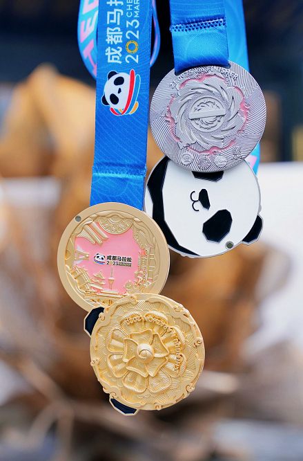 當日發(fā)布會現(xiàn)場,本次成都馬拉松完賽獎牌正式亮相。遵循“精雕細琢,別具巧思”的設計宗旨,獎牌將芙蓉花作為主體元素,加上經(jīng)典太陽神鳥的守護,傳承與創(chuàng)新在獎牌上得到了體現(xiàn)。獎牌背面采用了感光變色材料,經(jīng)紫外線照射后會產(chǎn)生顏色變化,還原了“醉芙蓉”的色澤變化區(qū)間。
