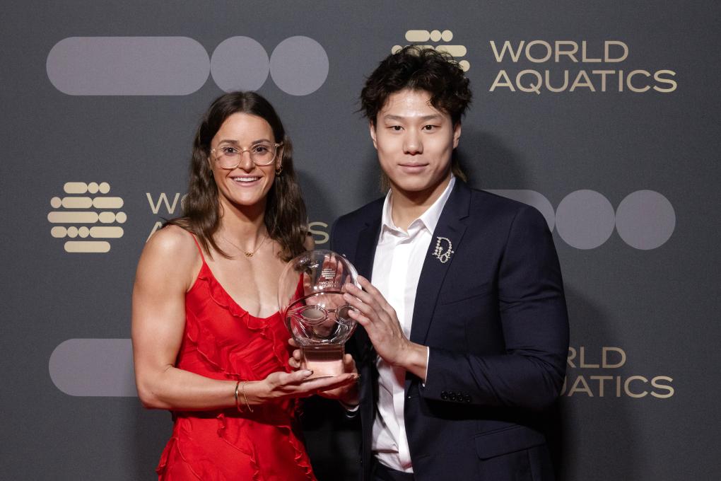 10月23日,在匈牙利布達(dá)佩斯,中國選手覃海洋獲選世界泳聯(lián)年度最佳男子游泳運(yùn)動員,澳大利亞選手麥基翁獲選最佳女子游泳運(yùn)動員。新華社發(fā)(弗爾季·奧蒂洛攝)