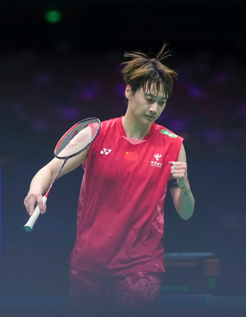 4月10日,陳雨菲在比賽中慶祝得分。新華社記者 孫非 攝