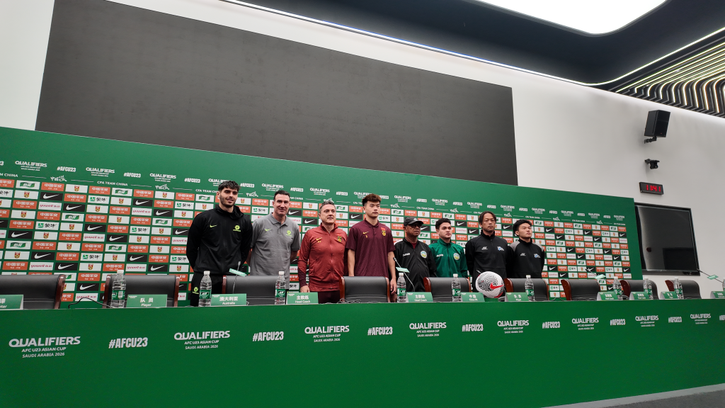 中國隊球員及教練團(tuán)隊在新聞發(fā)布會上