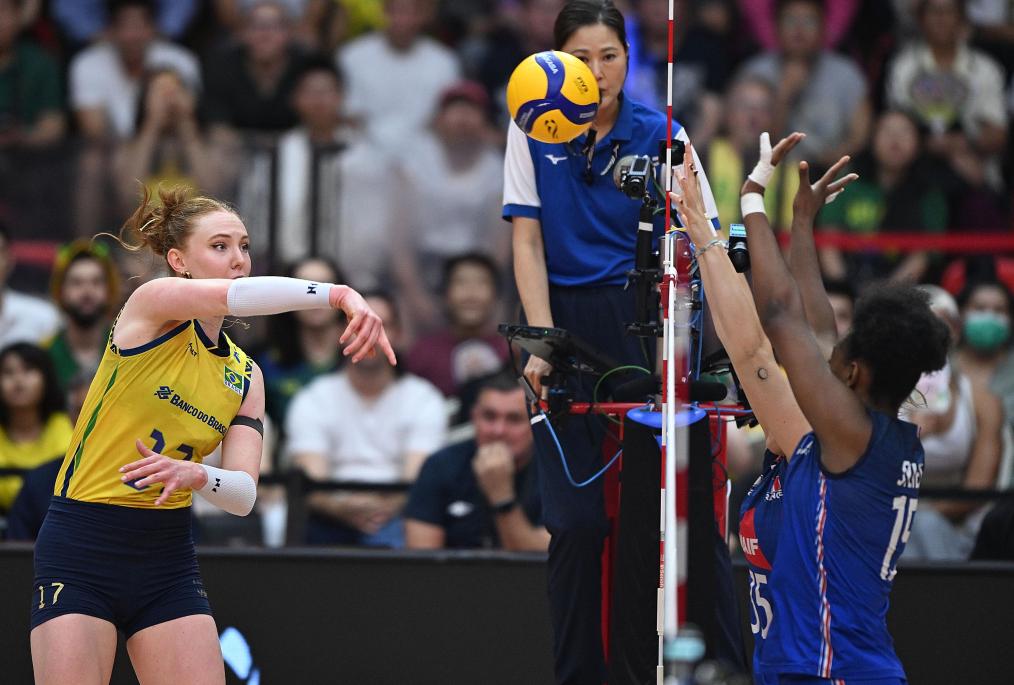 巴西隊(duì)在小組賽中曾以3:2險(xiǎn)勝法國隊(duì),這次她們以27:25、33:31和25:19勝出。前兩局的爭奪異常激烈,第二局更是一波三折。法國隊(duì)一度取得19:15的優(yōu)勢(shì),卻被巴西隊(duì)連得4分追成19平。此后,巴西隊(duì)以24:22率先拿到局點(diǎn),卻被法國隊(duì)連得3分以25:24反超。領(lǐng)先幾度易手、雙方又多次錯(cuò)過局點(diǎn)之后,比分來到31平。關(guān)鍵時(shí)刻,庫迪耶斯扣球成功,接下來加比在反擊中推攻得分,幫助巴西隊(duì)以33:31險(xiǎn)勝。