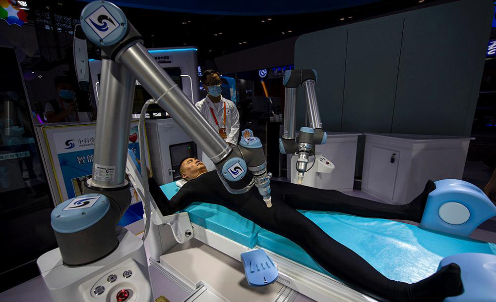 △2020年服貿(mào)會綜合展區(qū),參觀者正在體驗中醫(yī)智能經(jīng)絡(luò)導(dǎo)引機(jī)器人。