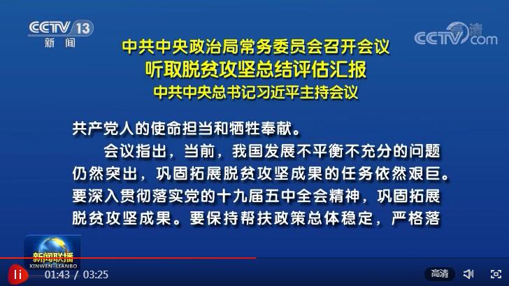 12月3日,中共中央政治局常務(wù)委員會(huì)召開會(huì)議,聽取脫貧攻堅(jiān)總結(jié)評估匯報(bào)。習(xí)近平總書記主持會(huì)議并發(fā)表重要講話。在講話中,總書記總結(jié)了黨的十八大以來脫貧攻堅(jiān)工作取得的成績,肯定了各級黨委和政府以及社會(huì)協(xié)同發(fā)力、合力攻堅(jiān)的卓越付出。央視網(wǎng)《聯(lián)播+》特梳理講話及會(huì)議要點(diǎn),以饗讀者。