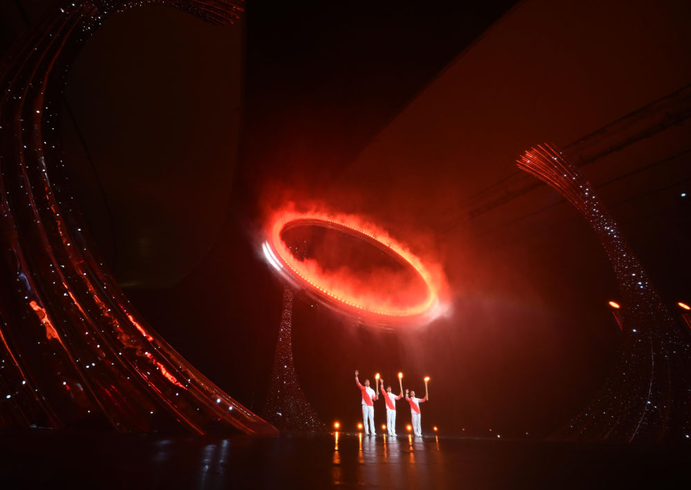 2025年11月9日,第十五屆全國(guó)運(yùn)動(dòng)會(huì)開幕式在廣東奧林匹克體育中心舉行。這是火炬手蘇炳添(中)、張家朗(左)、李祎點(diǎn)燃主火炬后向觀眾致意。新華社記者 肖藝九 攝
