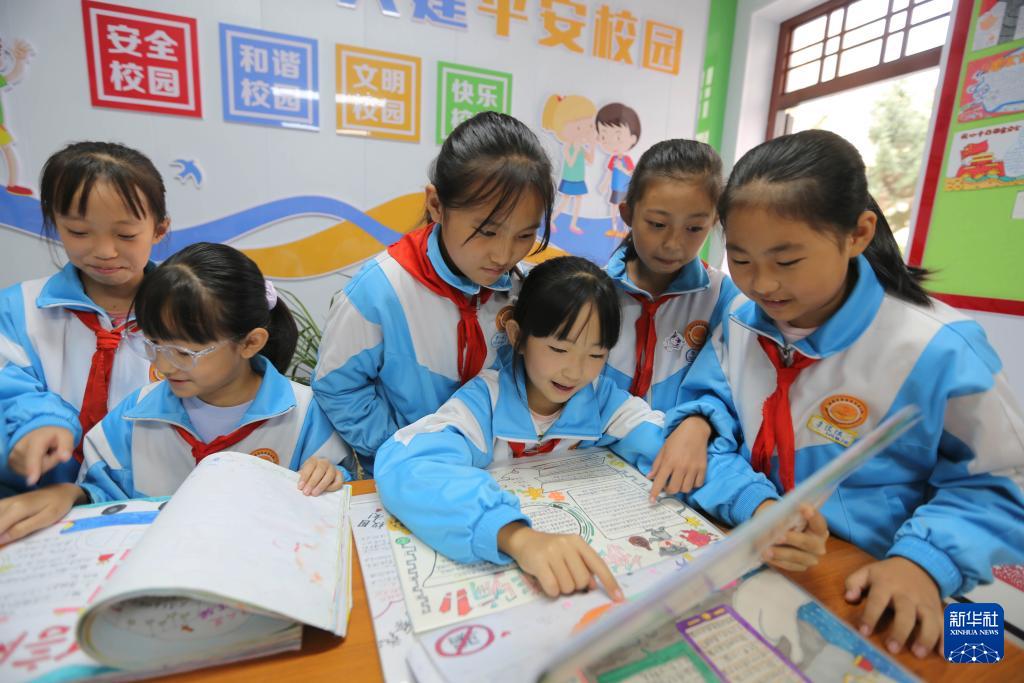 9月11日,甘肅省定西市安定區(qū)東關(guān)小學(xué)的學(xué)生利用手抄報(bào)學(xué)習(xí)網(wǎng)絡(luò)安全相關(guān)常識。(新華社發(fā) 王克賢 攝)