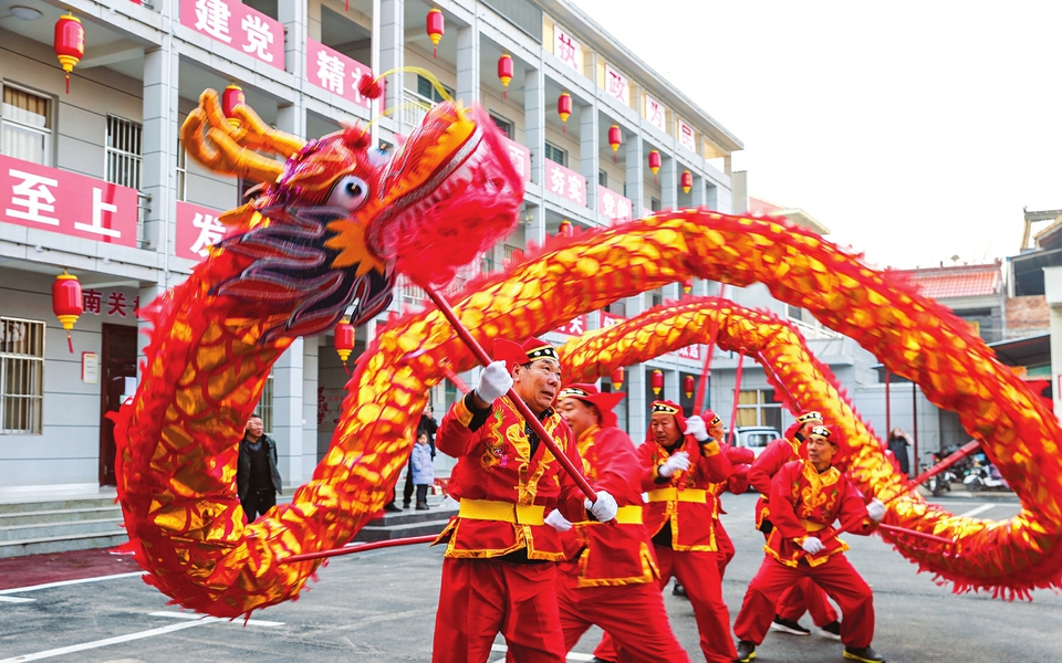2月9日,在夏縣瑤峰鎮(zhèn)南關村黨群服務中心,村民在進行《二龍戲珠》民間社火表演,喜迎新春佳節(jié)。張秀峰 裴國峰攝