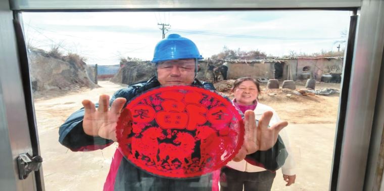 一個(gè)多小時(shí)后,皮卡車抵達(dá)紅糜梁村張偉小家。張偉小是村里的放羊漢,患有高血壓,定期給他捎降壓藥成了張吉?dú)g的順手工作。臨別前,張吉?dú)g仍不忘叮嚀他每天按時(shí)吃藥……皮卡車?yán)^續(xù)盤旋在溝壑之間,駛進(jìn)更偏遠(yuǎn)的的下養(yǎng)倉(cāng)村。張劉女和老伴早已等候多時(shí)。張吉?dú)g卸下他們子女寄來的快遞,得知今年他們的二兒子一家因工作無法返鄉(xiāng)過年,他便默默搬來木梯,將一對(duì)紅燈籠穩(wěn)穩(wěn)地掛在院門上。燈籠亮起時(shí),溫暖的光照在老人的臉龐上。