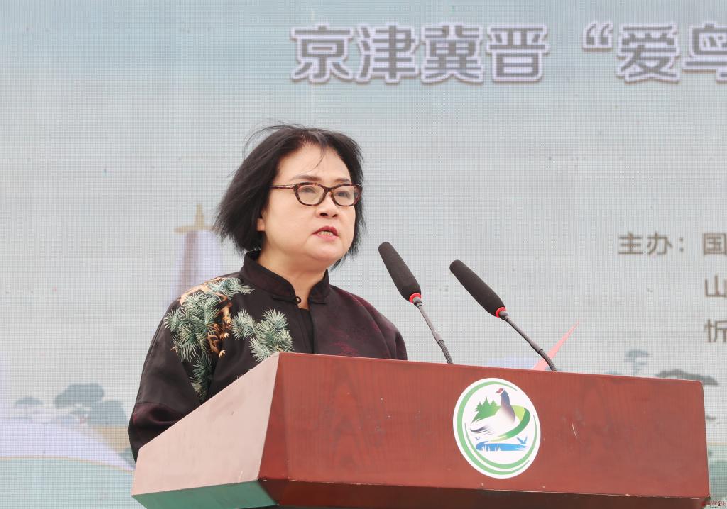 閆春麗致辭。范濤 攝 閆春麗致辭并宣布京津冀晉“愛(ài)鳥(niǎo)周”聯(lián)合宣傳活動(dòng)暨山西省第42屆“愛(ài)鳥(niǎo)周”啟動(dòng)。她說(shuō),京津冀晉山脈相連、林草交錯(cuò),為鳥(niǎo)類(lèi)生存繁衍和自然進(jìn)化提供了得天獨(dú)厚的自然條件。四省市要齊心抓好野生動(dòng)植物大保護(hù)平臺(tái)建設(shè),共同下好區(qū)域野生動(dòng)植物保護(hù)事業(yè)協(xié)同發(fā)展一盤(pán)棋,為華北豹、褐馬雞等旗艦物種在區(qū)域內(nèi)自由漫步、繁衍生息,打破空間阻隔、打通生態(tài)廊道、打造適生環(huán)境,攜手邁上林草高質(zhì)量發(fā)展新臺(tái)階。