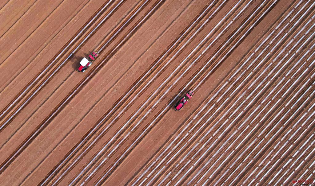 4月21日,在忻州民宇農(nóng)業(yè)甜糯玉米標(biāo)準(zhǔn)化種植基地,兩臺玉米膜側(cè)播種機(jī)聯(lián)合作業(yè),搶農(nóng)時進(jìn)行播種。近年來,該基地采用玉米膜側(cè)播種綜合栽培技術(shù)進(jìn)行播種,有效解決了高溫導(dǎo)致玉米早衰等問題,提高了降水利用率,增加了玉米產(chǎn)量。 (張存良攝)