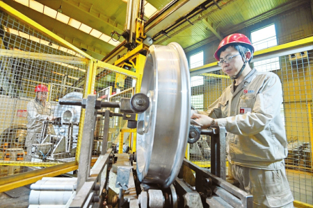 6月14日,暑氣已盛,記者走進(jìn)太原重工軌道交通設(shè)備有限公司車輪廠二線生產(chǎn)車間,只見一排排銀灰色車輪陳列有序,即將作為高鐵之足奔馳于世界各地,閃耀中國制造的熠熠光華。