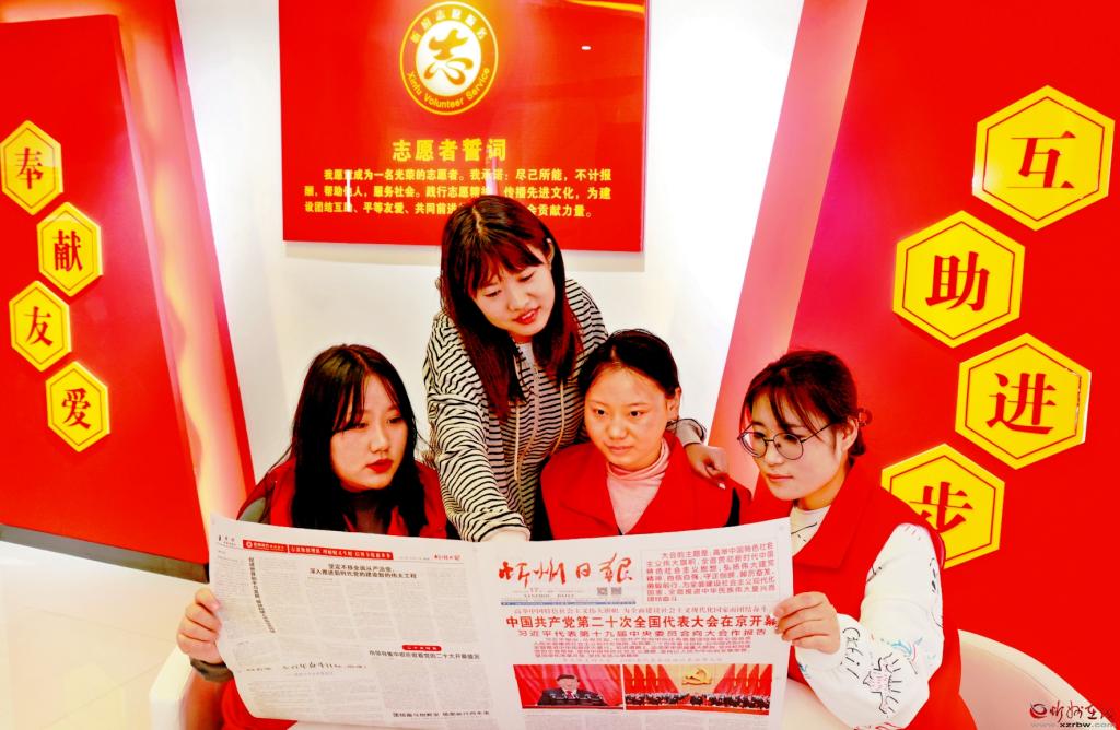 10月19日,忻府區(qū)新時代文明實踐中心工作人員正在閱讀報紙,學(xué)習(xí)黨的二十大報告。 (本報記者 張存良攝)