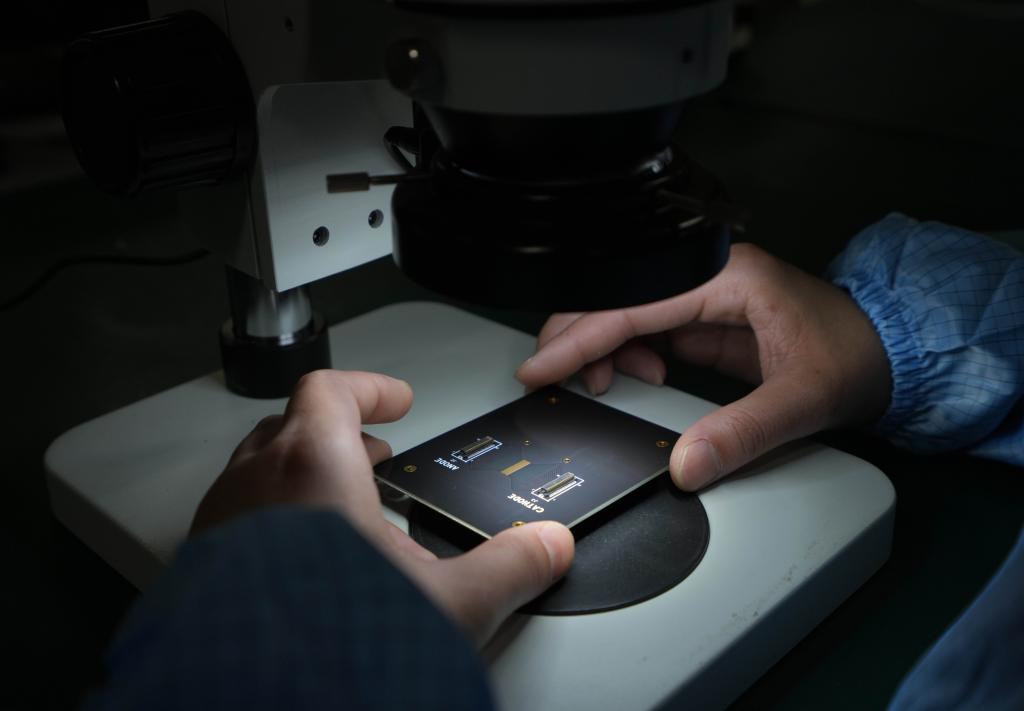 6月2日,工作人員在蘇州光電技術(shù)研究院的封裝測試公共服務(wù)平臺(tái)車間內(nèi)檢測一塊激光雷達(dá)芯片。新華社記者 李尕 攝