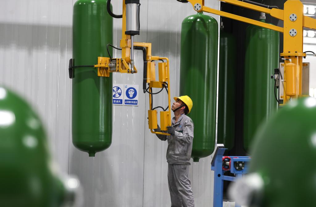 5月31日,一名工作人員在江蘇國富氫能技術(shù)裝備股份有限公司的儲(chǔ)氫罐生產(chǎn)車間內(nèi)作業(yè)。新華社記者 楊磊 攝
