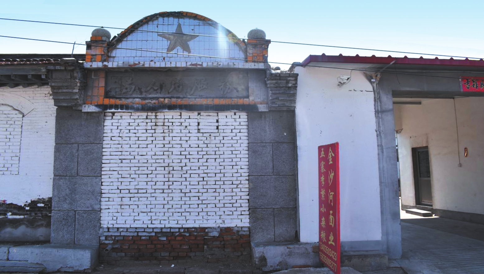 舊址分東西兩院:東院東西長(zhǎng)70米、南北長(zhǎng)20.3米,占地面積1421平方米,面闊18間,青筒灰瓦布瓦頂;西院南北長(zhǎng)20.3米、東西長(zhǎng)31.6米,占地面積641.48平方米,面闊11間,人字頂青瓦房。大門坐西朝東,正中央設(shè)券門,門額正中刻五角星,門楣上方有毛體書寫“為人民服務(wù)”字樣。