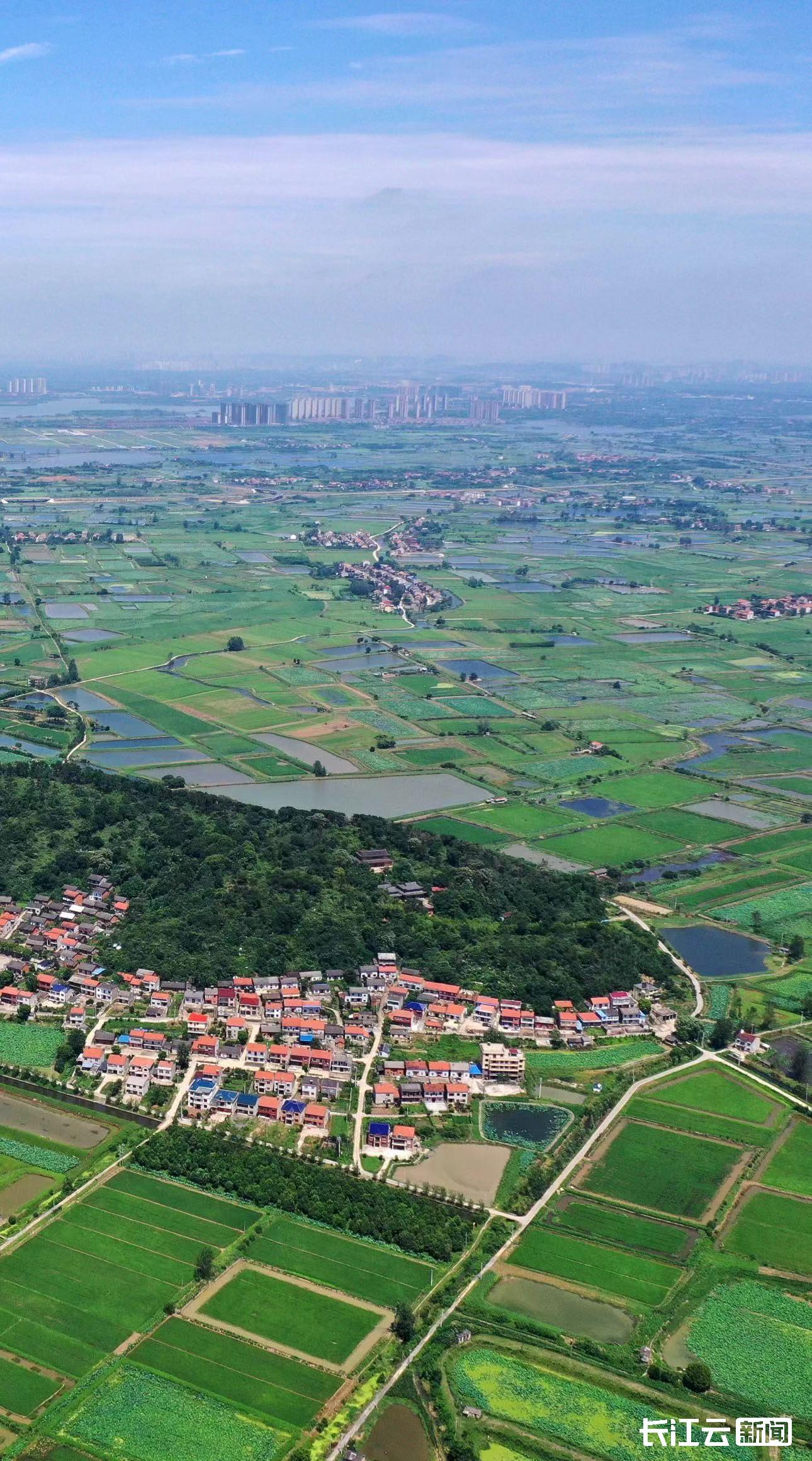 ▲鳥(niǎo)瞰春天的鄂州長(zhǎng)港鎮(zhèn)峒山村,村容整潔、綠樹(shù)成蔭