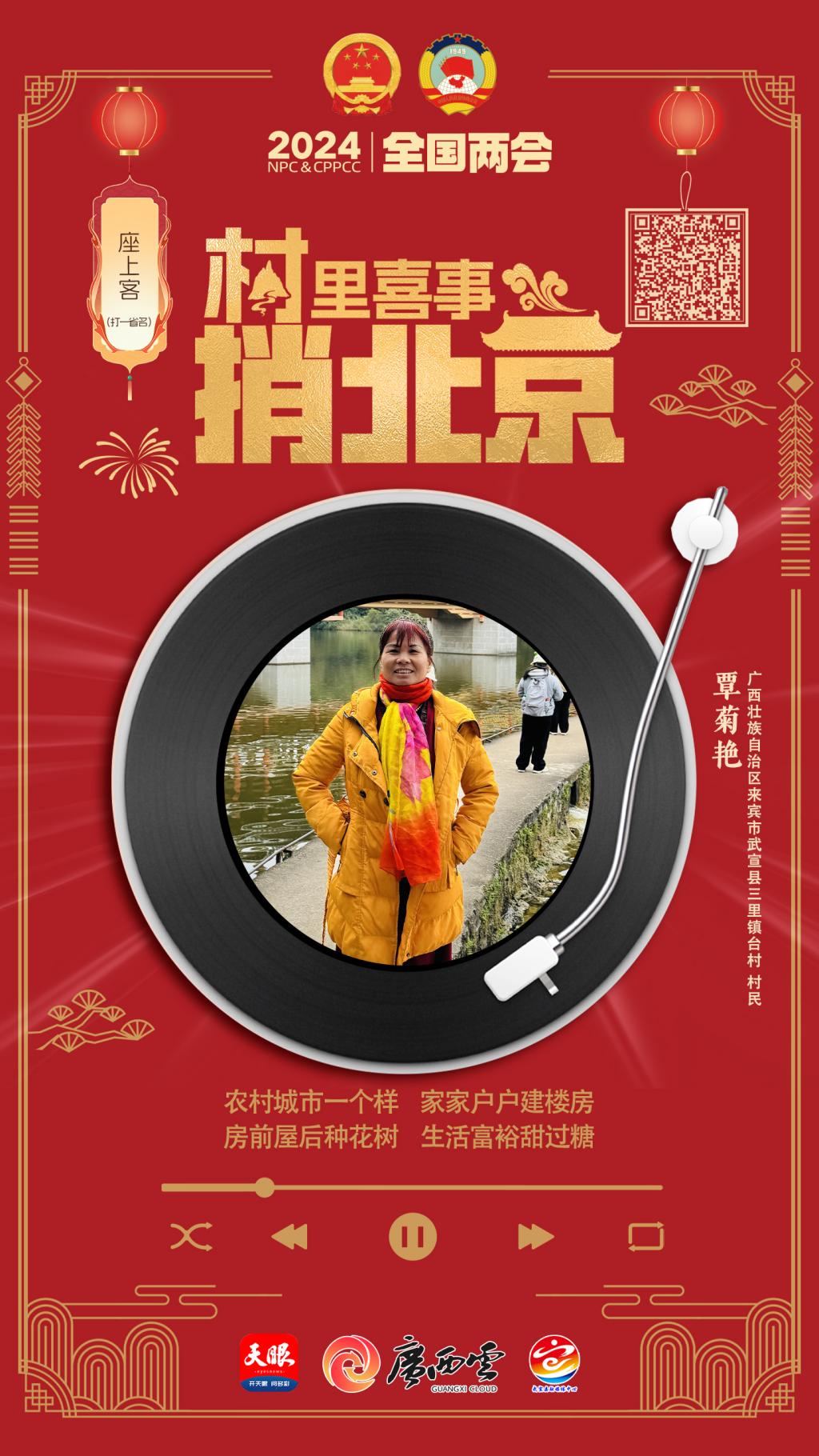廣西壯族自治區(qū)來(lái)賓市武宣縣三里鎮(zhèn)臺(tái)村村民覃菊艷用歌聲唱出了如今的美好生活