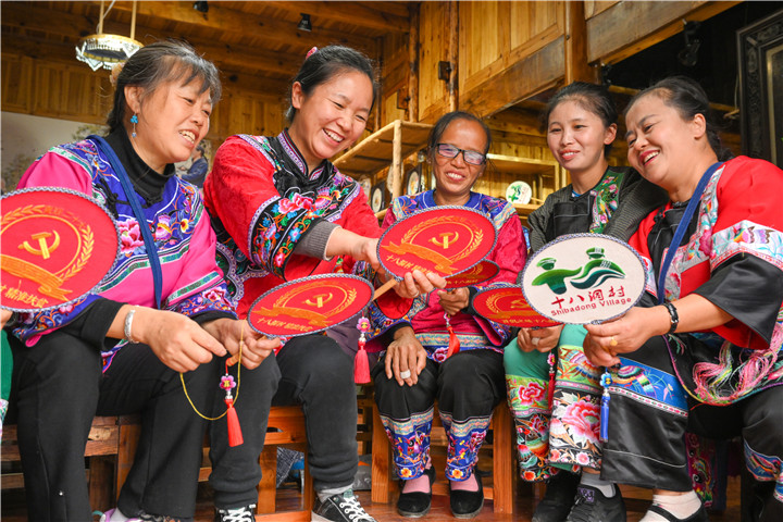 在湖南省湘西土家族苗族自治州花垣縣雙龍鎮(zhèn)十八洞村,村里的婦女在學(xué)習(xí)繡制“十八洞村”苗繡文創(chuàng)產(chǎn)品。郭立亮 攝