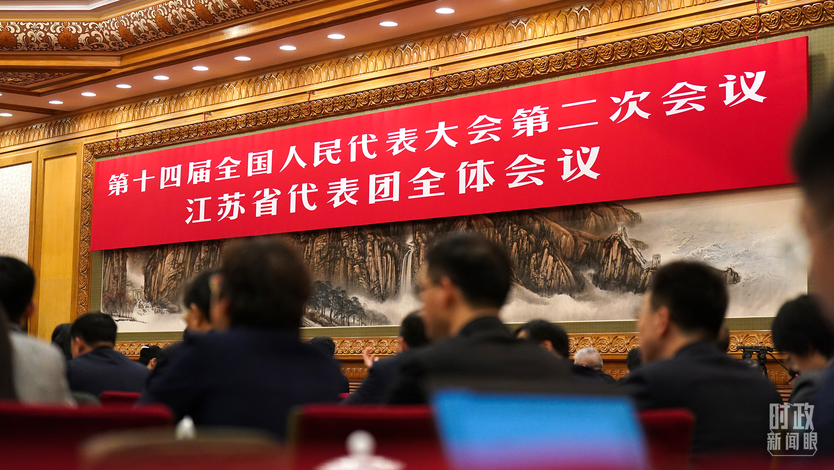 △江蘇代表團(tuán)全體會(huì)議,會(huì)標(biāo)醒目。(總臺國廣記者李晉拍攝)