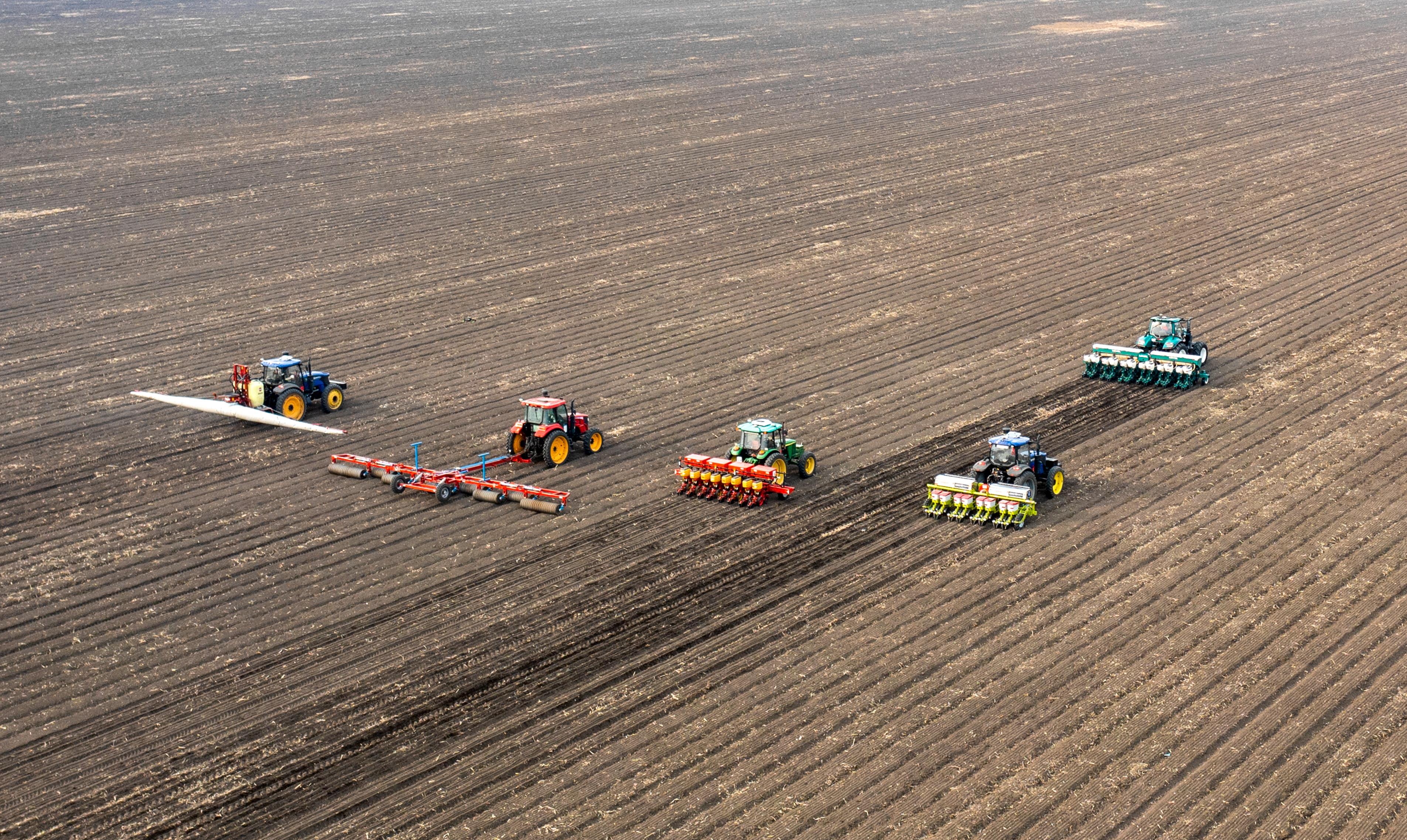 △2023年春,黑龍江雙鴨山,北大荒農(nóng)業(yè)股份友誼分公司第五管理區(qū)玉米智能機械化作業(yè)播種現(xiàn)場。
