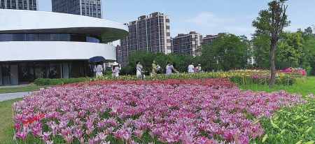 百合花種類(lèi)繁多,形態(tài)各異。純凈高雅的白色、熱情嫵媚的紅色、明麗澄澈的橙黃、浪漫俏皮的粉紅、雍容華貴的紫色,形似漏斗,又如喇叭,或向上開(kāi)花,張揚(yáng)外翻、極端華麗,或含露低垂,矜持含蓄、超凡脫俗。花間蜂蝶飛舞,暗香浮動(dòng),游人三五成群,在花叢合影拍照,游玩嬉戲,好不愜意。市民王女士對(duì)這里贊賞有加:“看到這五顏六色的百合花,我的心情像盛開(kāi)的花一樣,特別美!這里每季有每季的花開(kāi),每次來(lái)都有不一樣的驚喜和精彩。”