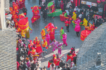 2月9日,民間藝人在平遙古城內(nèi)表演傳統(tǒng)民俗社火,喜迎元宵佳節(jié)。梁生仁攝