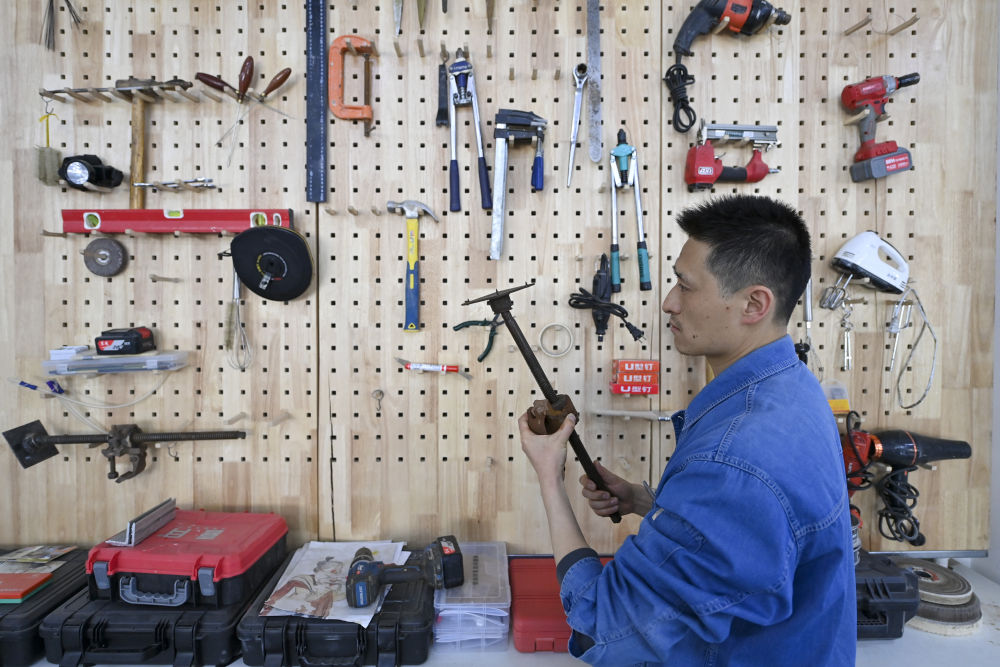 4月15日,在云岡研究院可移動文物修復(fù)室,工作人員孫麗娜在進行鐵器修復(fù)。