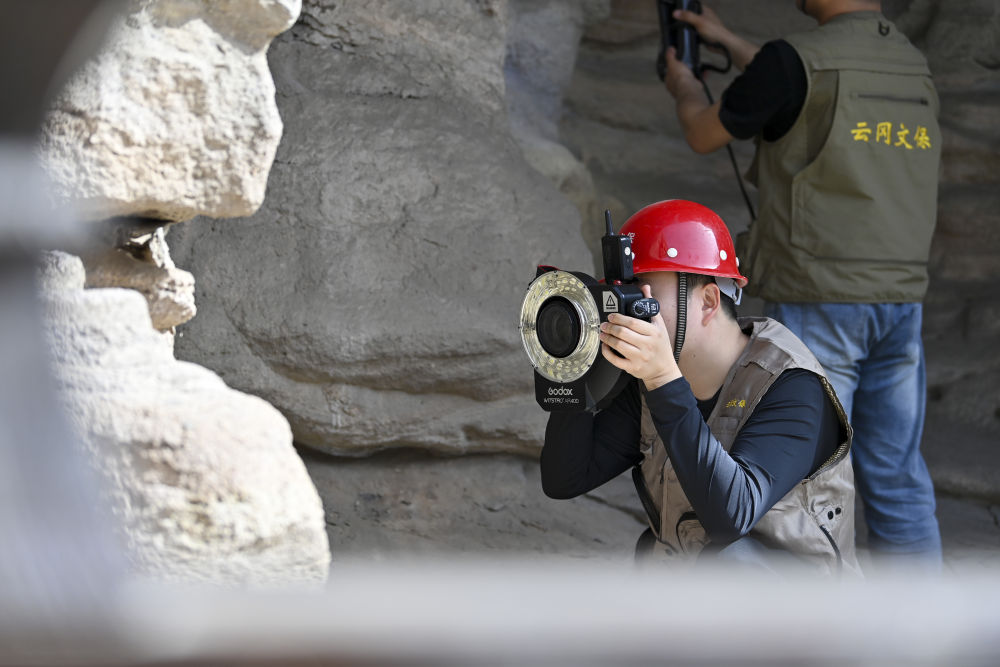 4月16日,云岡研究院數(shù)字化保護中心工作人員黃繹帆(左)在云岡石窟進行數(shù)字化信息采集。