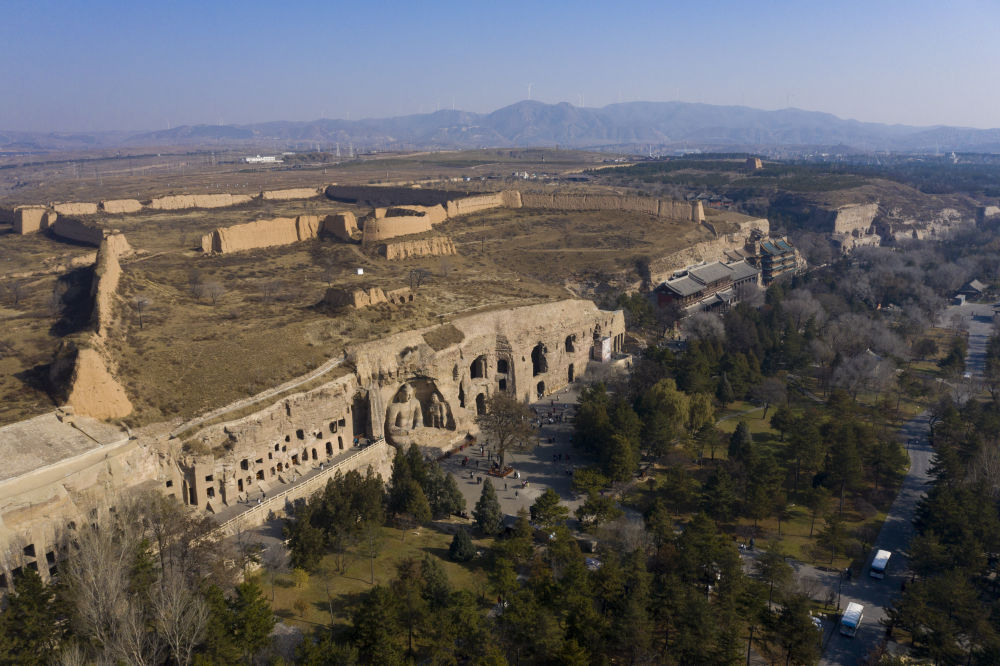 這是2024年11月7日拍攝的云岡石窟全景(無人機照片)。
