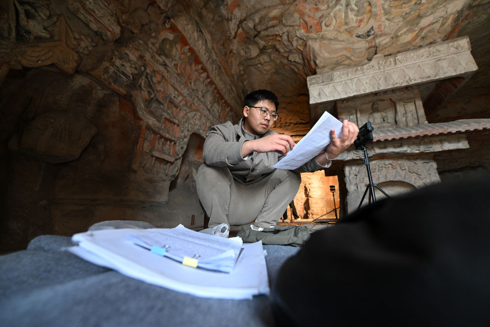 4月16日,在云岡石窟,云岡研究院數(shù)字化保護中心工作人員潘博(右)在進行數(shù)字化信息采集。隨著“數(shù)字檔案”不斷完善