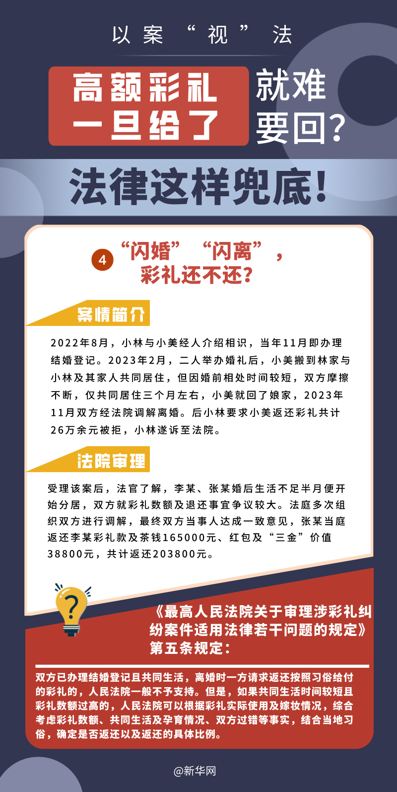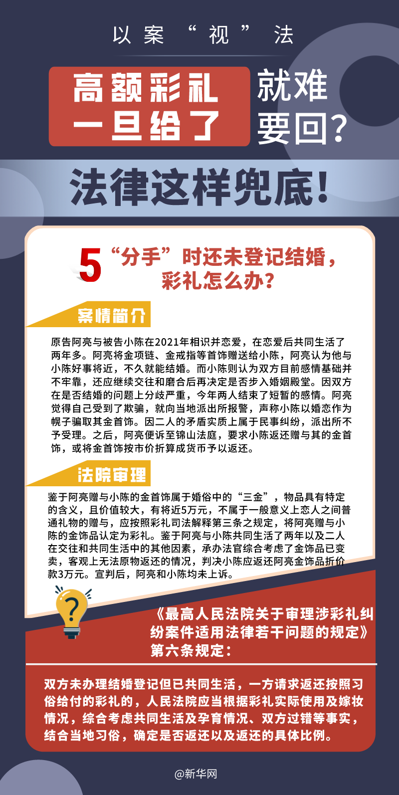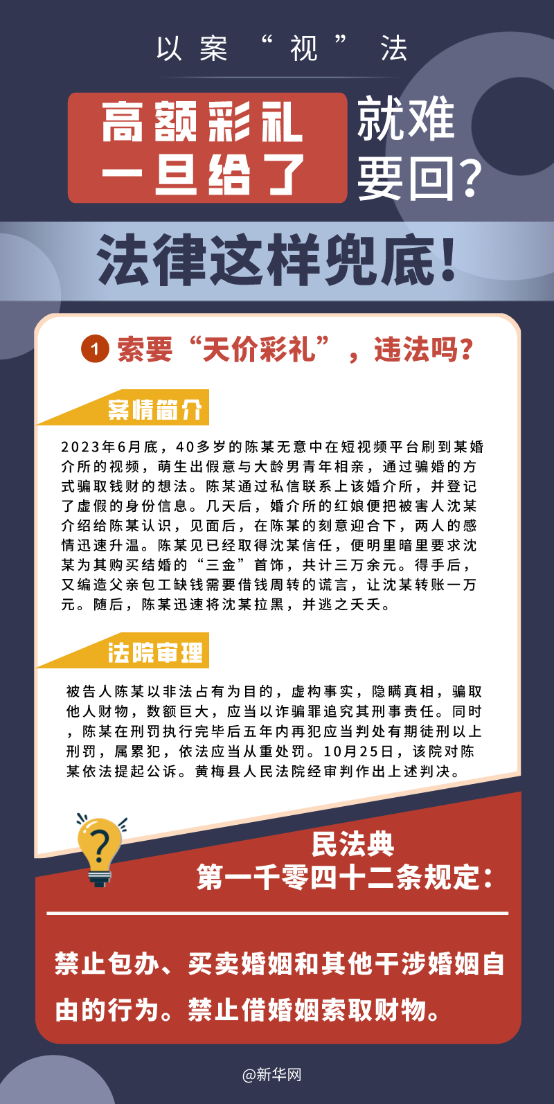 “五一”長(zhǎng)假期間,各地迎來了婚禮高峰期,“彩禮”話題,尤其農(nóng)村高額彩禮現(xiàn)象備受關(guān)注。破解高價(jià)彩禮,在解決爭(zhēng)議的層面,司法盡了最大努力兜底。本期《以案“視”法》針對(duì)涉“高額彩禮”糾紛,帶大家學(xué)習(xí)相關(guān)法律知識(shí)。