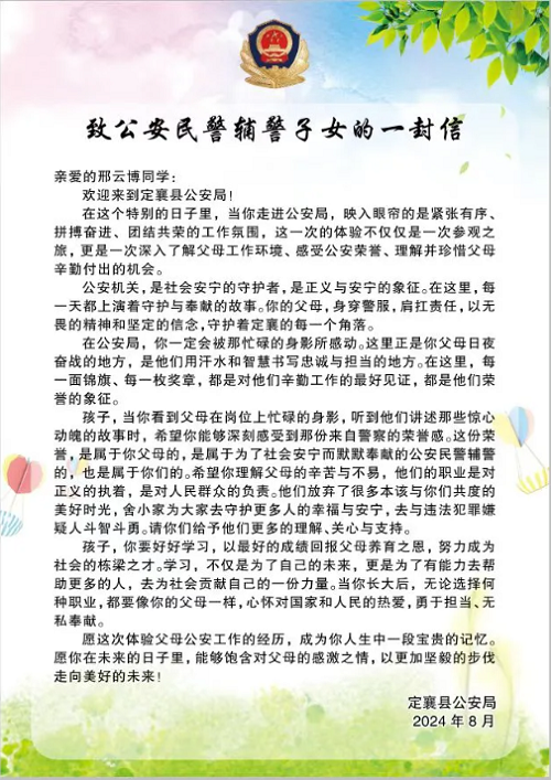 為進一步增強中小學(xué)生反詐、禁毒、交通安全意識,通過小手拉大手等形式,大力學(xué)習(xí)、宣傳、弘揚武霖同志英勇無畏、忠誠為民的高尚品質(zhì)。8月20日上午,定襄縣公安局精心策劃,組織開展了“警娃探警營”主題警營體驗日活動,50余名民輔警子女和警爸警媽共同走進警營,體驗警察生活、感受警營文化。