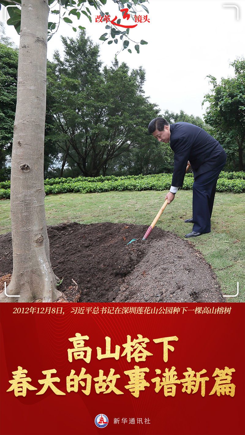 深圳蓮花山,一棵迎風(fēng)而立的高山榕,挺拔茂盛。樹(shù)前一方花崗石碑上,鐫刻著“習(xí)近平手植樹(shù)”。