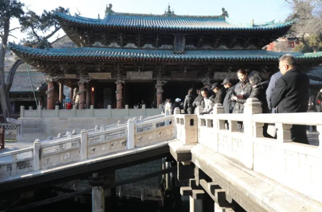 圣母殿(央廣網(wǎng)記者 郎麒 攝) 中國最早的水陸立交橋——魚沼飛梁。魚沼飛梁西依圣母殿,東鄰獻(xiàn)殿,初建在北魏之前。飛梁的形式古樸,橫跨于魚沼之上,借以觀賞景物,南北東西四面伸長,如鳥之振翼欲飛狀,是中國少有的一種十字橋梁形式,被譽為中國最早的水陸立交橋。