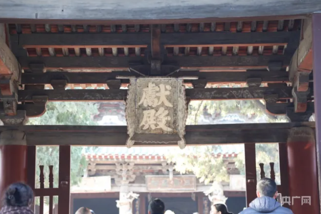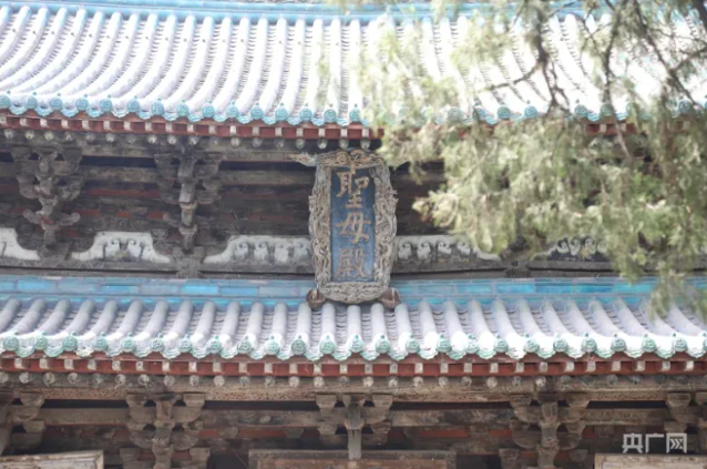 獻(xiàn)殿(央廣網(wǎng)記者 郎麒 攝) 晉祠“三匾” “難老”匾?!半y老”匾是難老泉亭的匾額,長1.45米,寬0.7米,是明末清初著名的思想家、文學(xué)家、詩人、醫(yī)學(xué)家、書畫家傅山所題?!半y老”二字出自《詩經(jīng)》中“永錫難老”,意味生生不息,青春永駐,其用筆蒼勁,頗具神韻。 “水鏡臺”匾。水鏡臺是一座古戲臺,懸掛匾額“水鏡臺”?!八R”之名取自《漢書》名句“清水明鏡不可以形逃”,寓意為人世間的善惡忠奸盡人皆知。此匾由清乾隆翰林、著名書法家楊二酉所題,書體清秀,筆力遒勁。