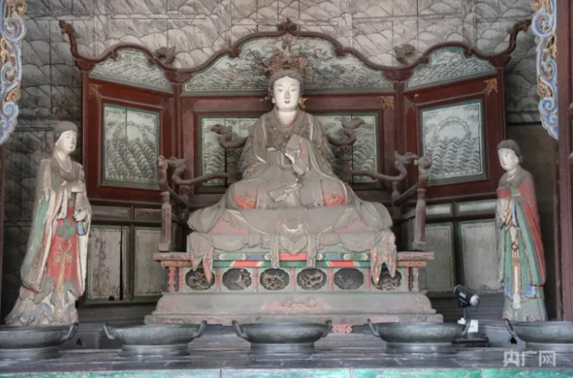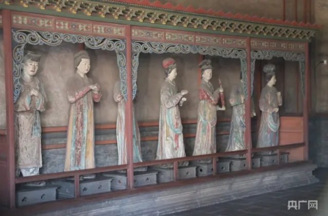 俯瞰晉祠公園(央廣網(wǎng)記者 郎麒 攝) 晉祠文化遺存極為豐厚,現(xiàn)存有宋、元、明、清時期的殿堂樓閣、亭臺橋榭等古建筑98座,彩塑114尊,鐵質(zhì)文物19尊,壁畫907.2平方米,楹聯(lián)匾額219幅,碑碣石刻444通,館藏文物40982件,古樹名木122株,其中千年以上古樹29株。是中國現(xiàn)存規(guī)模最大、跨越時代最久遠(yuǎn)、保存最為完整的唐宋祠廟式古典園林,被譽為中國古建筑博物館。 晉祠“三絕” 宋代彩塑的杰出代表——侍女像。宋代彩塑侍女像突破了宋以前宗教造像的模式,成為現(xiàn)實生活中真實人物的寫照,是按照封建社會的宮廷制排列的,是宋代皇室生活的縮影,展現(xiàn)了不同年齡、不同個性的女性形象,她們個個眉目傳神,形態(tài)瀟灑,栩栩如生,開創(chuàng)了雕塑藝術(shù)寫實作品的先河。它不僅是中國雕塑史上唯一反映宋代宮廷人物的造像,而且是中國雕塑史上藝術(shù)高超的罕見精品,被譽為是古今中外歷史上最偉大的雕塑藝術(shù)作品之一,在中國雕塑史和美術(shù)史上占有重要地位。