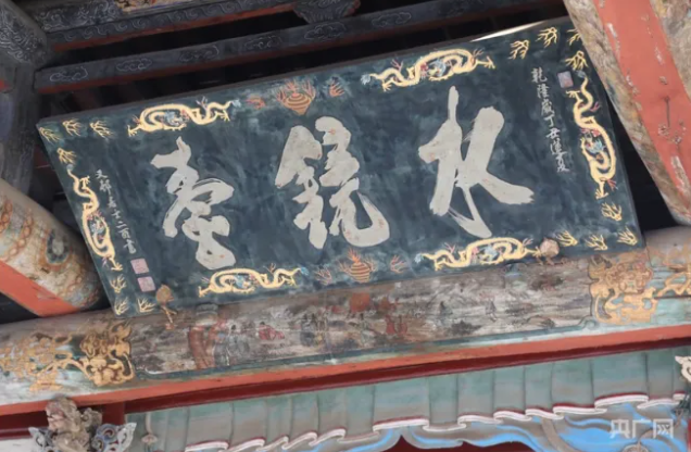 水鏡臺是一座古戲臺(央廣網(wǎng)記者 郎麒 攝) “對越”匾。對越坊懸掛匾額“對越”?!皩υ健倍殖鲎浴对娊?jīng)》中“對越在天,駿奔走在廟”“對”為報答,“越”為宣揚,意為報答宣揚祖先的高尚功德?!皩υ健必蚁鄠饔商h舉人、書法家高應(yīng)元所書,“對越”二字為榜書金字,筆力遒勁,氣勢磅礴,宛如山岳嵯峨,棱角俏麗。