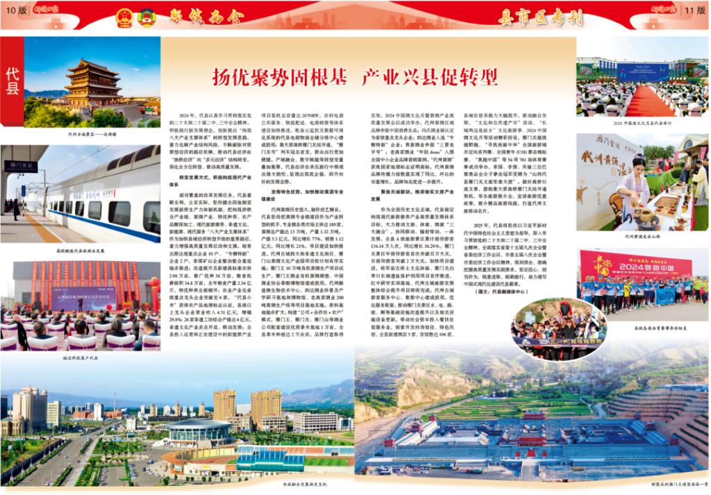轉(zhuǎn)變發(fā)展方式,積極構(gòu)筑現(xiàn)代產(chǎn)業(yè)體系面對繁重的改革發(fā)展任務(wù),代縣著眼全局,立足實(shí)際,堅(jiān)持健全因地制宜發(fā)展新質(zhì)生產(chǎn)力體制機(jī)制,把構(gòu)筑涉鐵全產(chǎn)業(yè)鏈、黃酒產(chǎn)業(yè)、特優(yōu)種養(yǎng)、農(nóng)產(chǎn)品精深加工、現(xiàn)代旅游康養(yǎng)、非遺文化、新能源、現(xiàn)代服務(wù)“八大產(chǎn)業(yè)支撐體系”作為加快縣域經(jīng)濟(jì)轉(zhuǎn)型升級的重要路徑,著力增強(qiáng)高質(zhì)量發(fā)展后勁和支撐。培育達(dá)限達(dá)規(guī)重點(diǎn)企業(yè)10戶、“專精特新”企業(yè)2戶,非煤礦山企業(yè)整治整合重組穩(wěn)步推進(jìn);改造提升及新建高標(biāo)準(zhǔn)農(nóng)田2.98萬畝,推廣優(yōu)種38萬畝,糧食機(jī)耕面積34.8萬畝,全年糧食產(chǎn)量2.34億斤,特優(yōu)種養(yǎng)全面鋪開;農(nóng)業(yè)產(chǎn)業(yè)化省級重點(diǎn)龍頭企業(yè)突破至6家,“代縣小米”獲得農(nóng)產(chǎn)品地理標(biāo)志認(rèn)證,縣級以上龍頭企業(yè)營業(yè)收入4.31億元,增幅29.8%;26家非遺工坊綜合產(chǎn)值達(dá)6億元,非遺文化產(chǎn)業(yè)多點(diǎn)開花、聯(lián)動發(fā)展;全縣投入運(yùn)營和正在建設(shè)中的新能源產(chǎn)業(yè)項(xiàng)目裝機(jī)總?cè)萘窟_(dá)2670MW,農(nóng)村電商公共服務(wù)、物流配送、電商銷售等體系建設(shè)加快推進(jìn),配備云監(jiān)控及數(shù)據(jù)可視化系統(tǒng)的代縣電商物流倉儲分揀中心建成投用;集大原高鐵雁門關(guān)站開通,“雁門關(guān)號”列車冠名首發(fā),群眾出行更加便捷。產(chǎn)城融合、數(shù)字賦能等轉(zhuǎn)型變量疊加集聚,代縣經(jīng)濟(jì)在承壓前行中展現(xiàn)出強(qiáng)大韌性,呈現(xiàn)出筑底企穩(wěn)、回升向好的發(fā)展態(tài)勢。